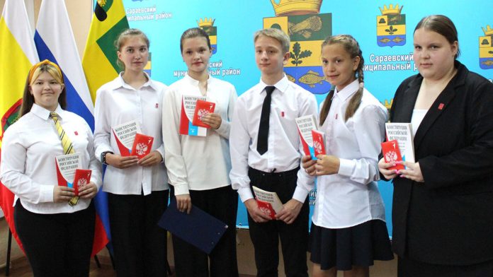 В среду, 9 июля Валерий Дмитриев, глава районной администрации, вручил паспорта школьникам, достигшим 14-летнего возраста. Вместе с паспортом школьники получили еще и томик Конституции РФ, которую им вручила Оксана Рычкова, начальник отделения по вопросам миграции сараевской полиции.