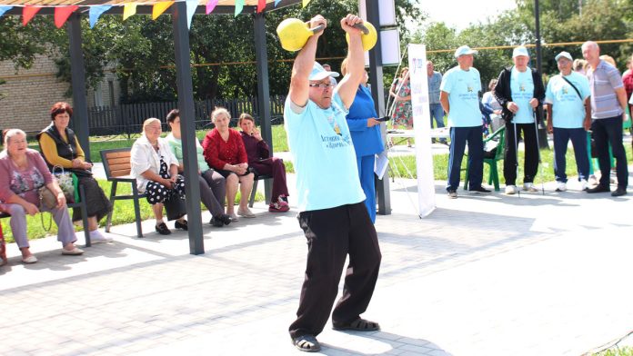 Силовик Борис Рожнов, упражняясь с гирями, показал, что такие занятия возможны в любом возрасте, было бы только желание для занятий.